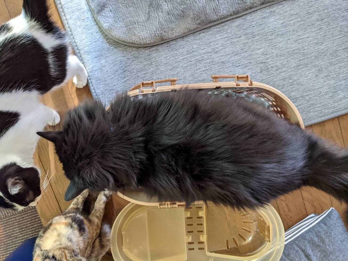 出掛ける準備にかごを出すと入れ代わり立ち代わりかごに入り始めました。