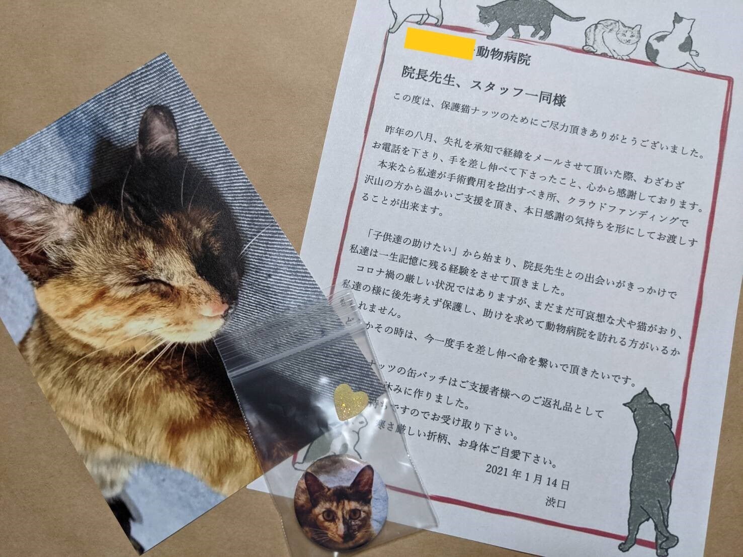 ご返礼品のポストカードと缶バッチと共にお手紙を添え、手術費用264,000円をお渡し致しました。