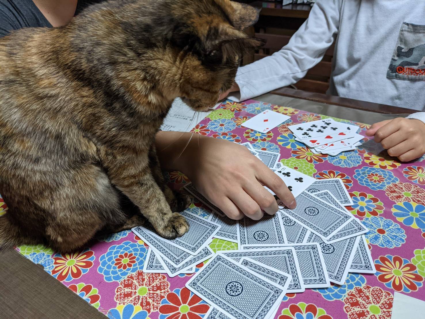 この日は、お風呂を誰が洗うかトランプで決めたのですがナッツは興味深々です。