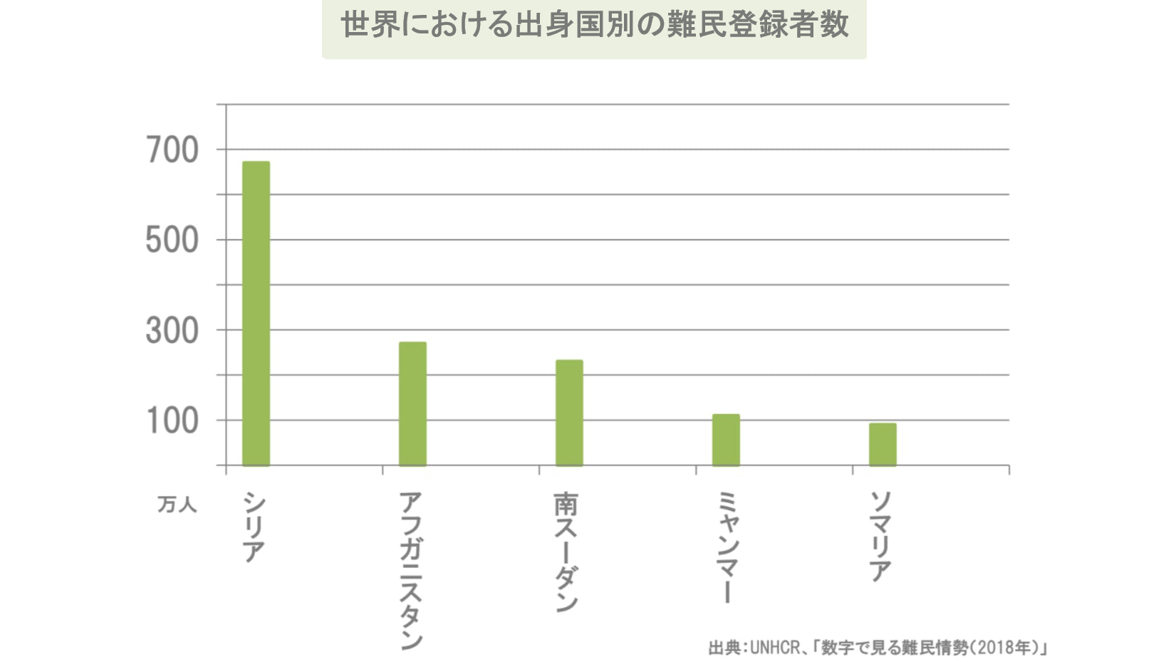 全世界において、戦争や迫害によって強制的に住む場所を奪われ、難⺠として登録されている人々の数は 7,950 万人にのぼります。そのうち、シリア難⺠の登録者数は 660 万人であり、内戦勃発から9年目を迎えた現在も、難⺠登録者数の出身国ランキングでは上位であり続けています。