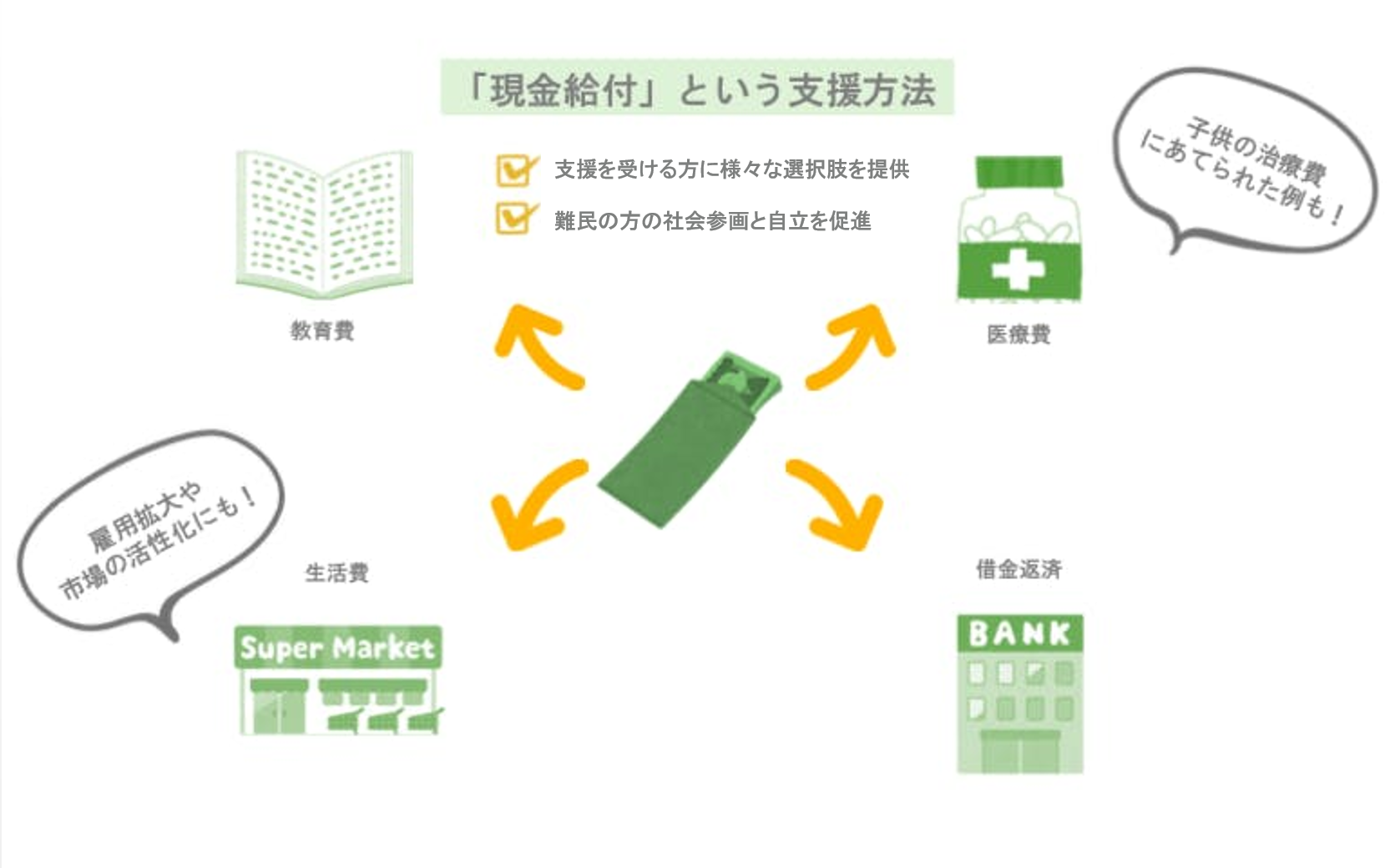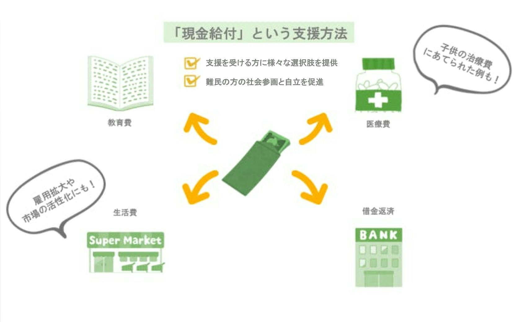 さらに⻑期的な影響としては、現地の市場や雇用を活性化することにも繋がります。そのうえ、物資支援に比べて現金給付は輸送費を削減したり、支援物資を転売するリスクを抑えることも出来ます。