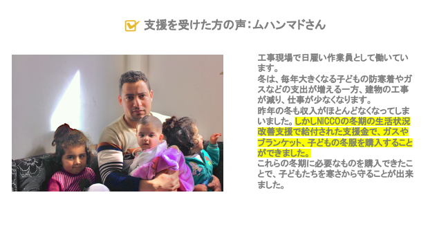 NICCOは、2012年よりヨルダンで「シリア難民及びヨルダン人貧困世帯の人々が冬を越すための生活支援」を行ってまいりました。