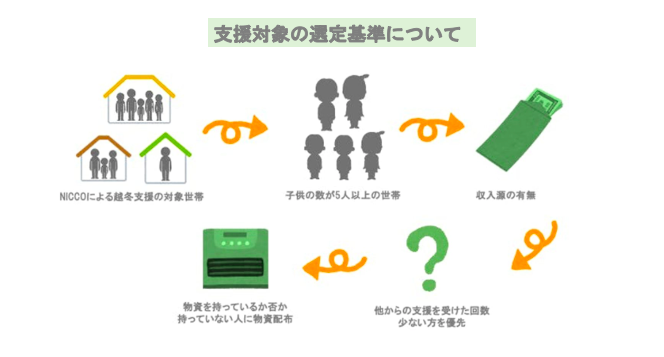 なお物資支援を実施する場合は、上記の基準に加えて、支援物資を持っていない世帯であることを条件としています。