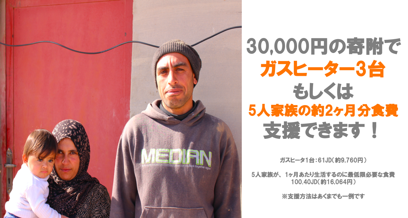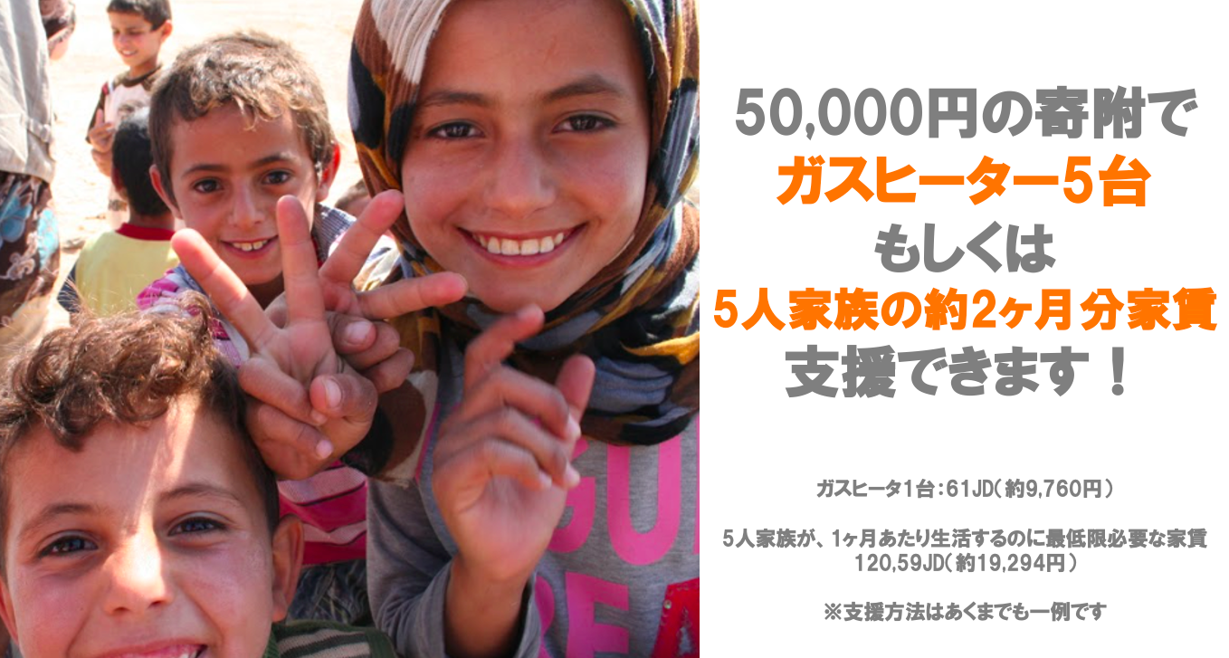 ● 1台およそ 12,000円(ヨルダン現地価格でおよそ75JD)のガスヒーターをおよそ18世帯の家庭に配布可能。