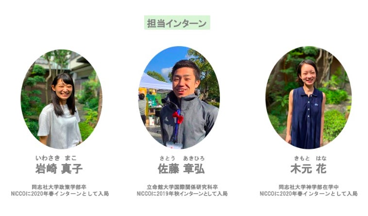 私たちは、公益社団法人 日本国際民間協力会(以下:NICCO)インターン生の岩崎・佐藤・木元です。