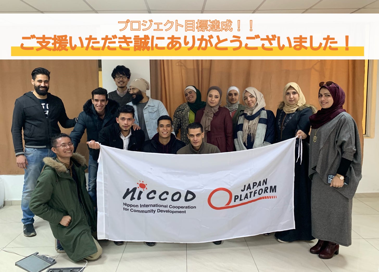2021/01/16 00:251月15日(金)23:59をもちまして、『ヨルダンのシリア難民に越冬支援を届けたい!』プロジェクトの掲載が終了しました!なんと42人の方から、343,000円のご支援を頂きました!沢山の温かい応援をして頂き、本当にありがとうございました!!担当者一同、心より深くお礼申し上げます。皆さまから頂いたご支援金は、シリア難民の方々やヨルダン人の貧しい方々が安心して冬を過ごすための支援として届けます。支援の様子は活動報告へ投稿して参ります。引き続きどうぞよろしくお願い致します!公益社団法人日本国際民間協力会(NICCO)インターン生 佐藤、木元、岩崎 もっと見る
