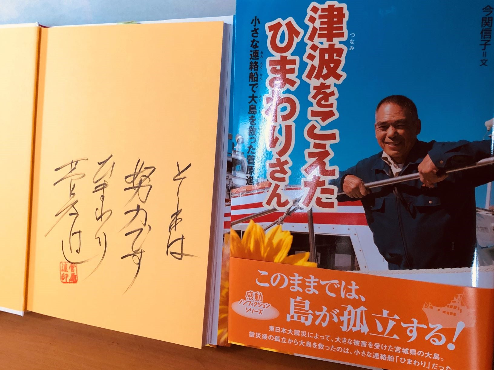 【2011.気仙沼港には津波で船が押し上げられていた】あの津波を乗り越えた「ひまわり」こそが、大島の希望となり、命の架け橋となったのです。大島の人々の「命綱」となった「ひまわり」は、約8カ月、無償で島民の足となったのです。ときには、海上で犠牲者を見つけたこともありました。この活躍が様々な海外メディアや、出版社の方に取り上げていただき、2012年には『津波をこえたひまわりさん 小さな連絡船で大島を救った菅原進』(著者=今関信子 佼成出版社)という書籍が出版されました。小学6年生の道徳副読本としても採用されています。