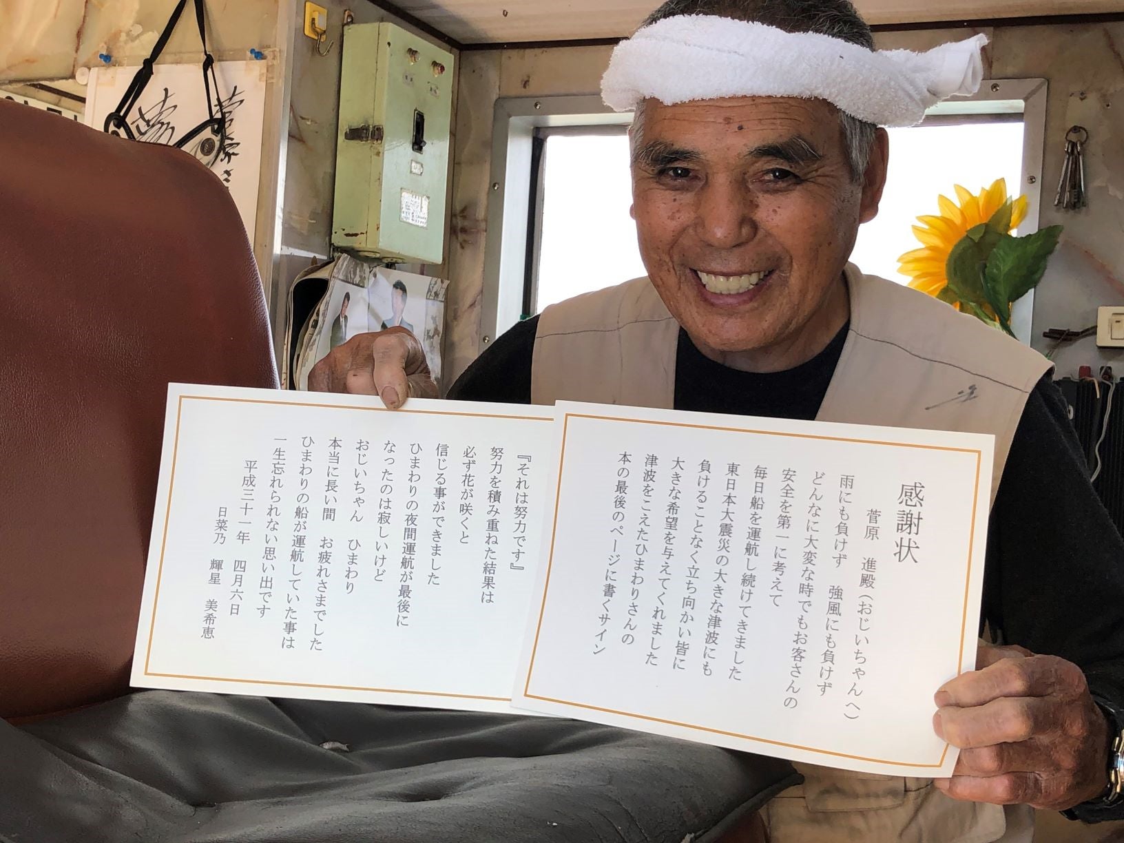 ■臨時船「ひまわり」を保存する会代表と船長 菅原進より、感謝のメッセージカードをお届けします。
