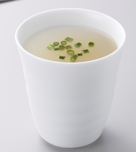 博多焼き鳥では、食後に鶏出汁のスープで〆るのが新定番。添付の塩を少々足しながら