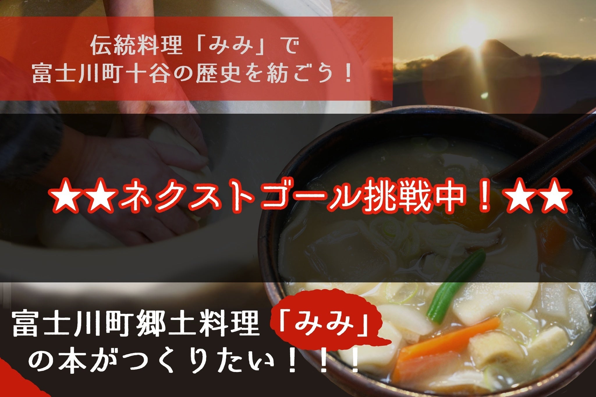 富士川町十谷の郷土料理「みみ」に関する本をつくり、富士川町の認知を広めることで、地域全体の活力を取り戻し、独自の歴史を未来に継承する手助けとなることを目的としています。