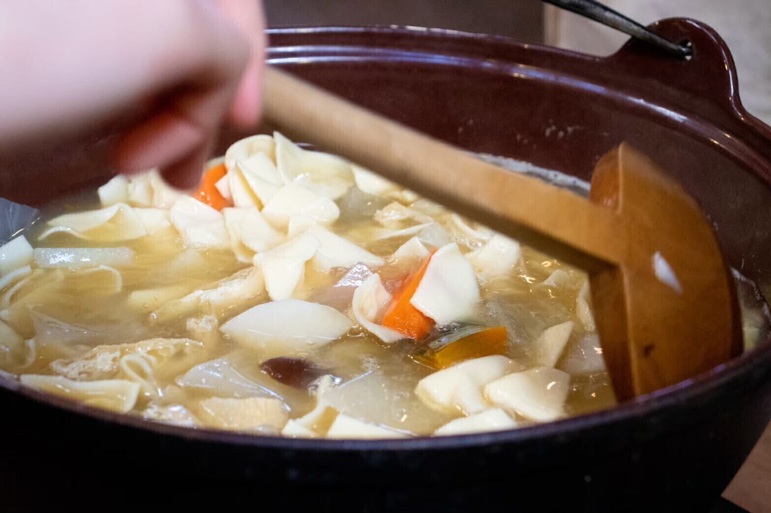 「みみ」は富士川町の十谷という集落に伝えられている郷土料理の一つです。小麦粉をよく練って薄くのばし、3㎝四方くらいの正方形に切り、一方の隣り合った二つの角をくっつけて、農具の「箕」(み)に似た形をつくり、これを人参やネギ、ゴボウやキノコ、カボチャなど好みの野菜を加えて煮込んだ料理です。