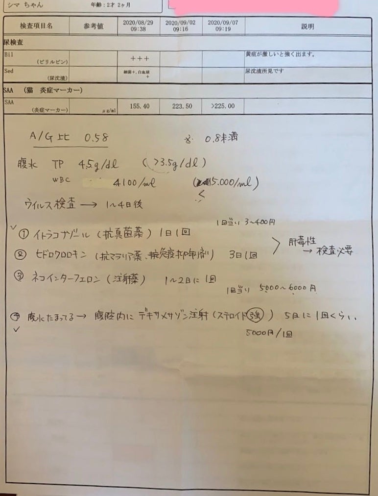 40度以上の発熱、黄疸、炎症が発症し、9月7日は、腹水もでました。