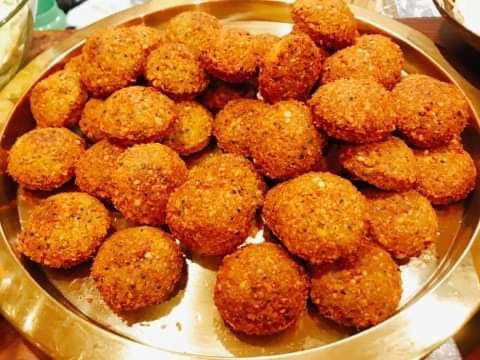 ひよこ豆をすり潰しスパイスと白ネギ、パセリ、ニンニクを混ぜて米油で素揚げしたものが