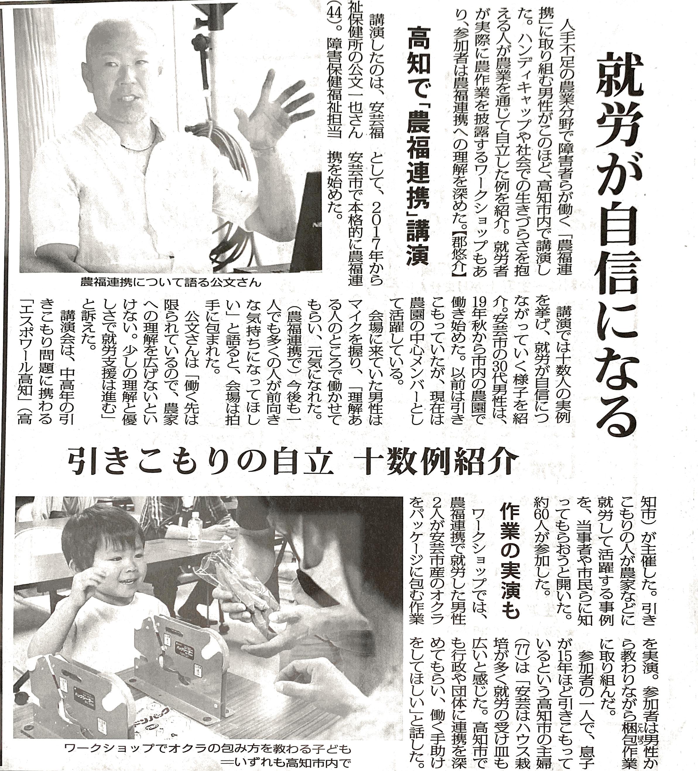 就労が自信になる 高知で「農福連携」講演 引きこもりの自立、十数例紹介 /高知 - 毎日新聞 https://mainichi.jp/articles/20200928/ddl/k39/040/273000c