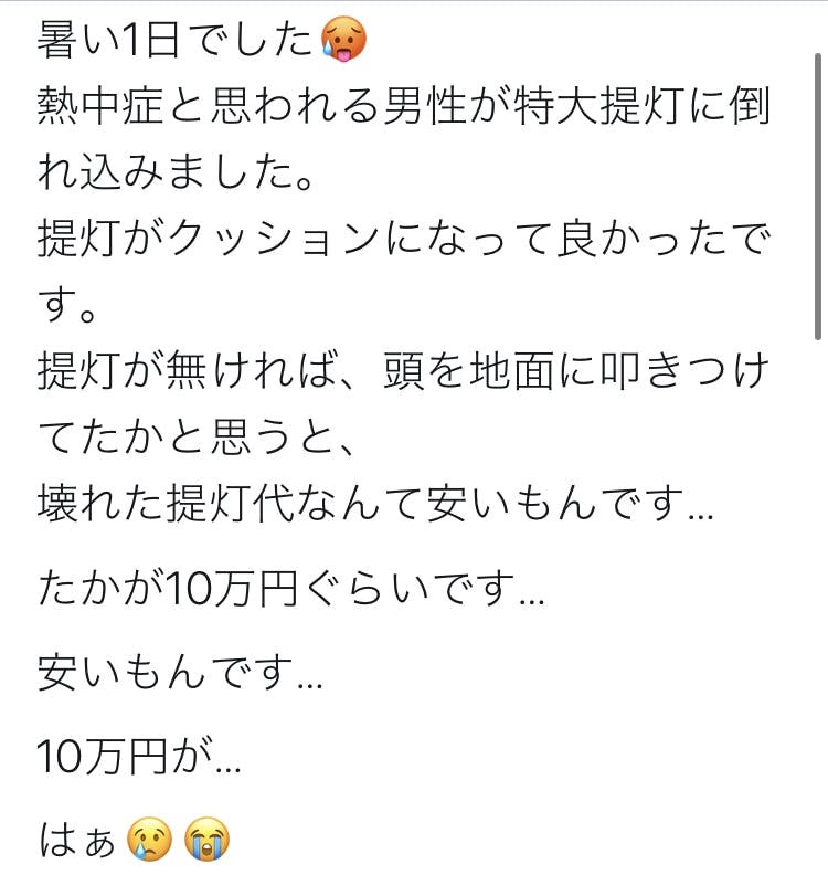 たこ焼たこばオリジナル提灯が先日、熱中症とみられる方を守りながら(クッションになりながら)ぶっ倒れました。