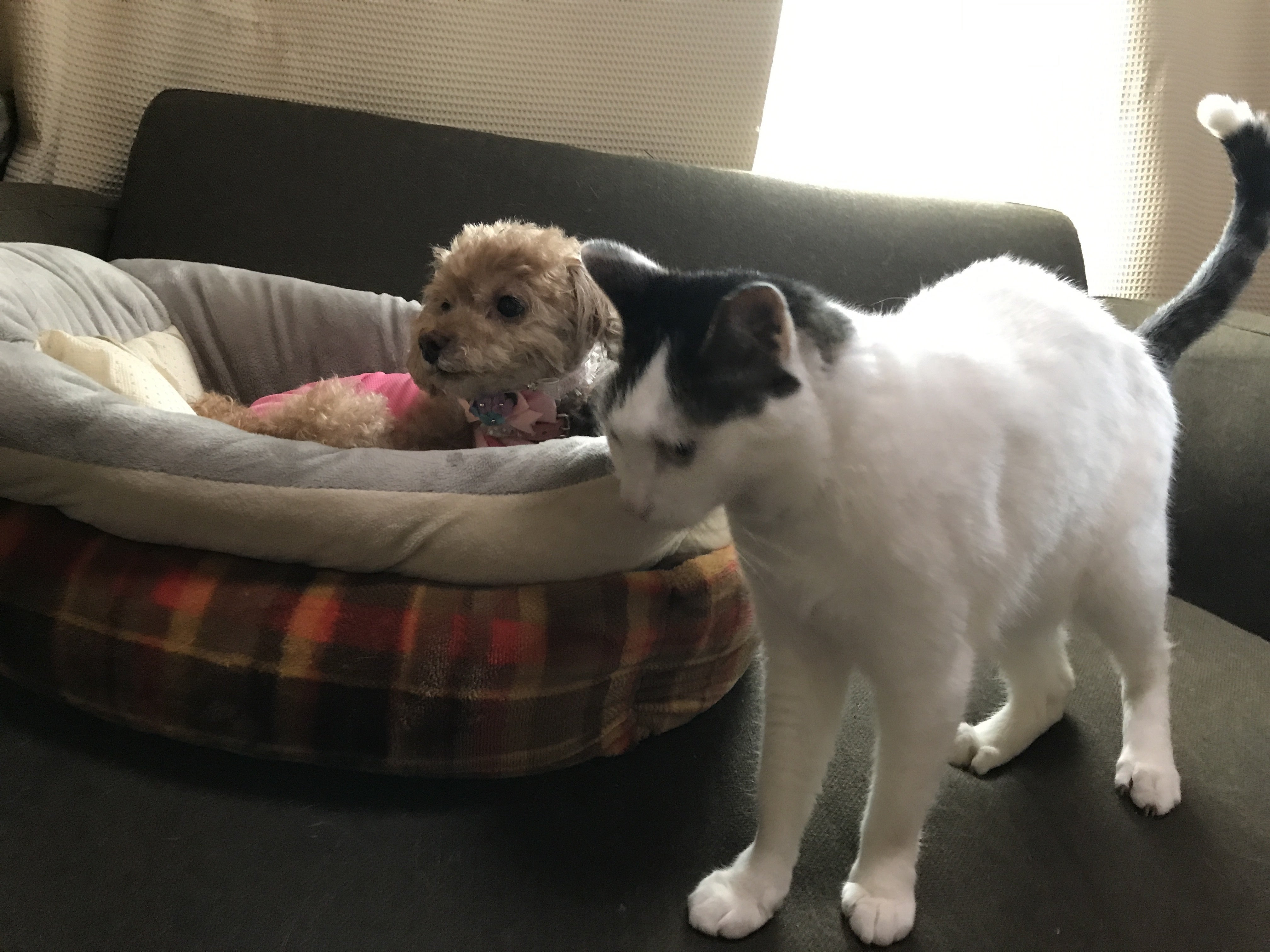 術後のるんるん:手術は無事成功!でも痛そう。エルサが心配しているよ。はじめの三日間は本当につらそうでした。一週間後くらいから動きたがるようになってきました。