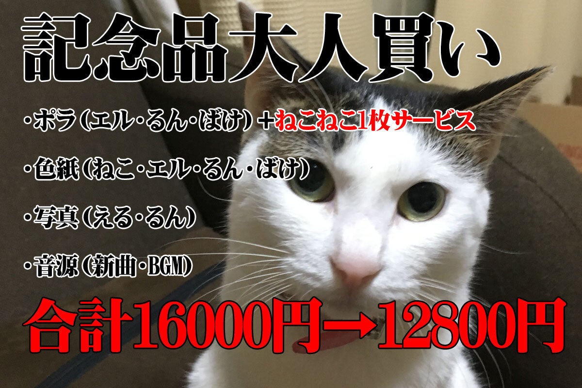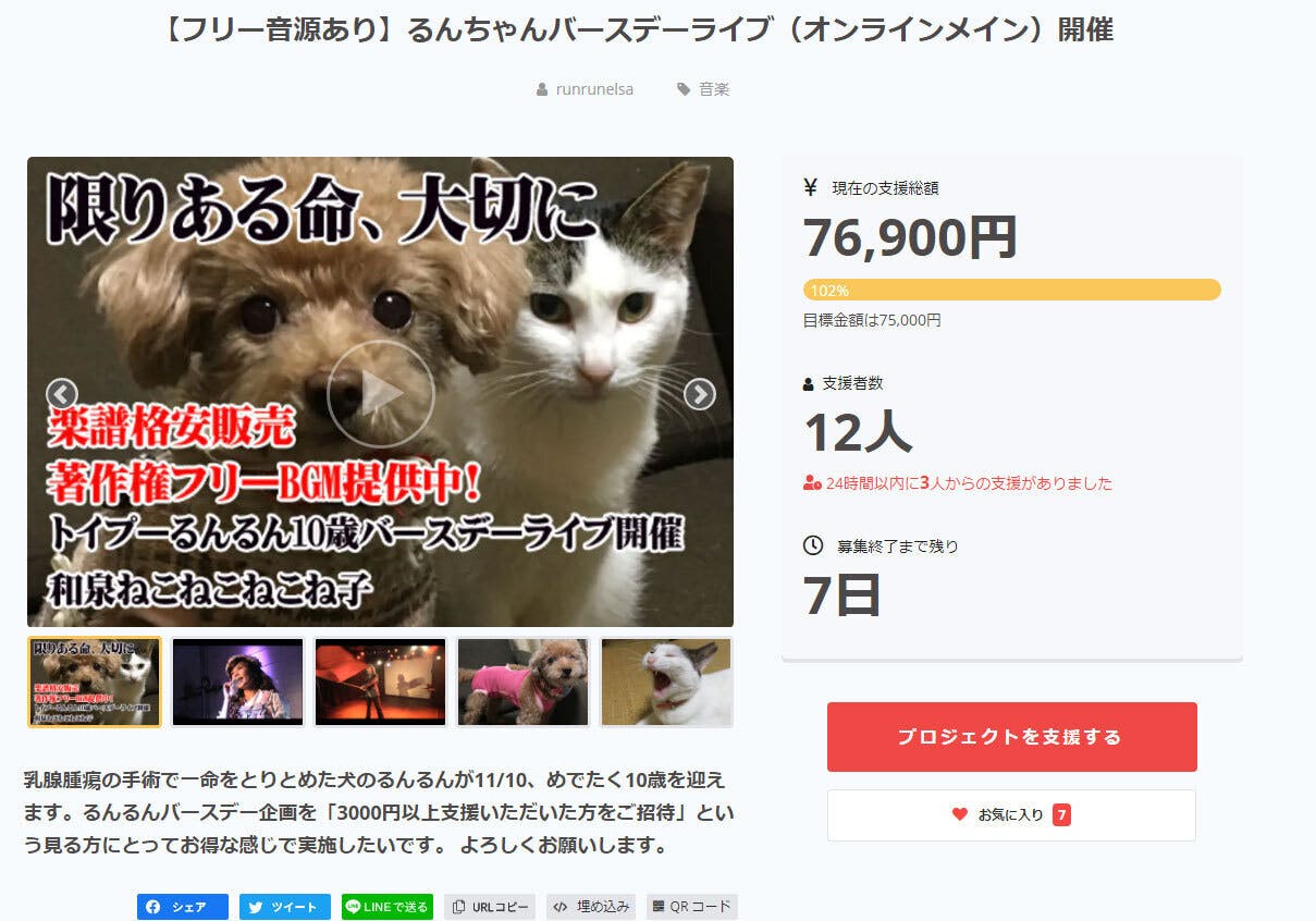 2020/09/21 13:38応援いただいた方ありがとうございます。わずか一週間でプロジェクトSUCCESS!告知期間も支援期間もやたらめったら短く、それは無理なんじゃないかとクラウドファンディングの担当者さんにも心配いただいていたのですが、おかげさまで達成できました。達成に間に合わなかった方も、27日まで「ライブ招待付きグッズ」は販売していますので、まだ間に合います!よかったらぜひ^^;延長ゴールとしては10万円達成でライブを休日開催というのがあります。るんちゃん、よかったね。みんなから応援届いたよ!少しでも長生きして、みんなと楽しく過ごそうね^^今回はるんちゃんのお祝いで、収益についてはあまり考えていないので、大幅に目標を超えたら寄付するのがいいかと思ったのですが、ちょっと間に合わなかった。正式に「共同開催」にする必要があるらしいです。今の時期はコロナで、ライブと言ってもオンラインになってしまうので、コロナが明けたらまた考えたいにゃ。「仕事」としては、ライブよりは映像のほうが規模は大きいのですが。↑ツタヤ1000店舗でレンタル「泣ける話」こういうのはクラウドファンディングで出番を増やそうとか、「こういう表現がやりたい」とか思ってもできないしにゃ(T_T)。私の個人的な思惑よりも先方ありきです。(FLASHは好意的な報道でほっとした^^;えるちゃんかわゆい!!!!!!るんちゃんもいる!!!)ライブはこういう規模でやるノウハウもつながりも何もない。それは悔しいのだけど、その分制作スタッフではなく「私が個人的に」「こういうことを表現したい」ということが実現させられる場でもあります。そして「たまたま」つながることのできた一人一人の方の応援と、ほかの演者さんのご協力や、作品を気に入ってくださるライブハウスのスタッフの方のご協力によって成り立ってきました。が、今やコロナ禍で、多くのライブが中止になり、国内音楽市場も通常の1/3なのだとか。そんななか、開催の応援本当にありがとうございます。映画みたいに規模が大きい場合、見てくれた方はただの「数字」になってしまい、楽しかったのか、満足いただけたのか、どういうご要望があるのかということも全然見えません。ライブを通して、直接お客さんと接することで演者としても鍛えて頂いてきたにゃと思います。まだ期間はありますので、これを機に一人でも多くの方とつながることができたらうれしいです。最後までどうぞよろしくお願いいたします。 もっと見る