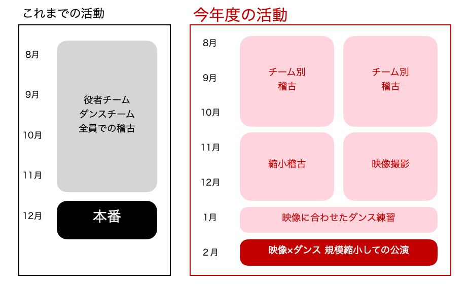 そんな意見も勿論ある中、私たちはこのコロナ禍でも出来る形を考えようとオンラインミーティング等を重ね、これまではメンバー全員が体育館などに集い朝から夕方まで稽古をしていた形を、下記のような方法に切り替えて活動を開始することに決めました。