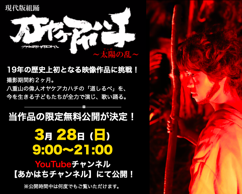 2021/03/24 11:03みなさんこんにちは。やいま浪漫の会・ウイングキッズリーダーズよりお知らせです。今年度、新型コロナウイルスの影響下の制限された活動範囲の中で、私たちは例年通りの公演ではなく「映像」という新たな挑戦をしました。また、2月には撮影した「映像」と「ステージ」のコラボレーションという形での公演を予定していました。その実現に向け、このページをご覧いただいている多くの皆さまにご支援をいただいたこと、心から御礼を申し上げます。悔しい思いもありますが、2月に予定していた公演は、八重山諸島の新型コロナウイルス蔓延状況を考慮し中止という形になりました。しかし、今年度は映像作品という形で子どもたちの今年度の成果を形にすることができました。この度、今回制作した映像作品を島内外の多くのみなさまにお届けしたいという浪漫の会・ウイングキッズリーダーズの思いから、YouTubeチャンネル【おやけあかはちチャンネル】にて、1日限りの限定公開をすることに決定いたしました!===================映像版「現代版組踊 オヤケアカハチ〜太陽の乱〜」限定無料公開令和3年3月28日(日)9:00〜21:00YouTubeチャンネル【あかはちチャンネル】にて公開!※パソコン、スマートホン、タブレットよりどなたでも無料でご覧いただけます。※上記時間内は何度でもご覧いただけます。一人でも多くのみなさまに、子どもたちのエネルギーを受け取っていただければと思います。 もっと見る
