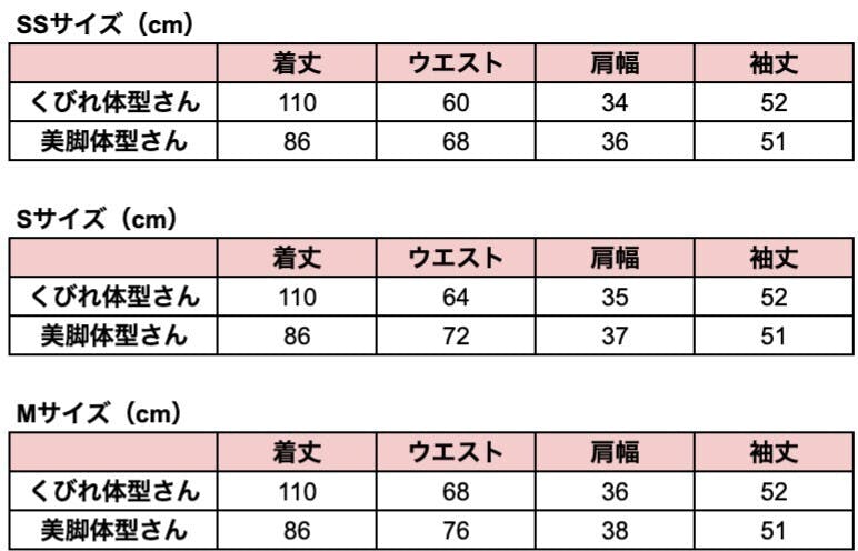 下記は、SSサイズ〜Mサイズのワンピース全体のサイズです。