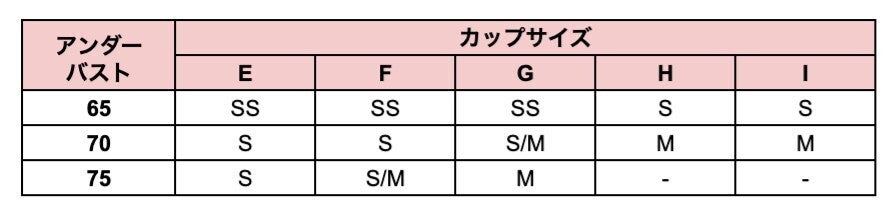 既製品のSMLのサイズ展開はサイズが大きくなる事で全体のサイズも大きくなってしまっていましたが、今回大きい胸の女性向けという事で推奨バストアップサイズからと、アンダーとカップ数からSS〜Mサイズの中で選んで頂く形にしました。
