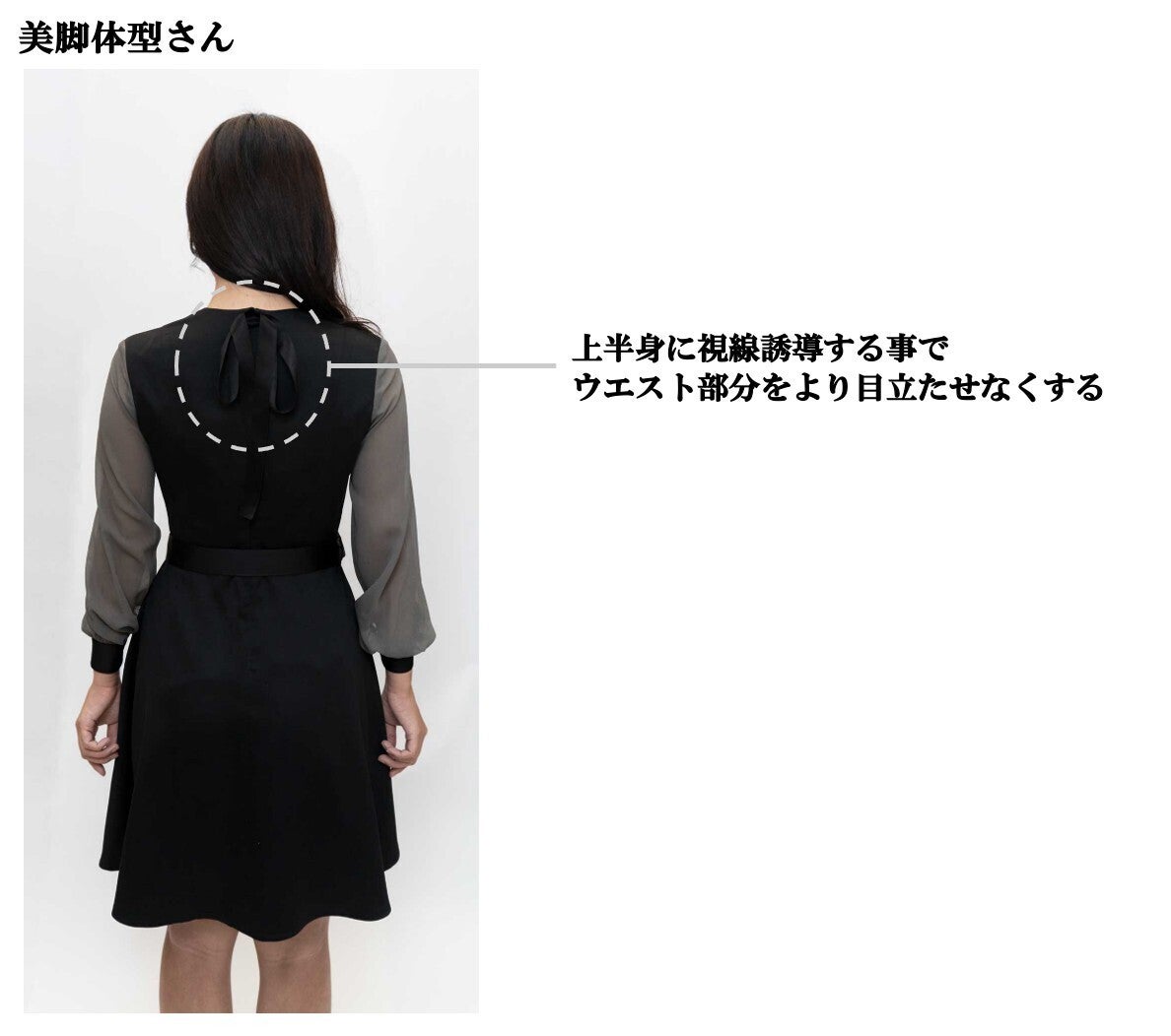 美脚体型さんは、バックスタイルを首元にリボンをつける事によって、上半身に視線誘導する事でウエスト部分をより目立たせなくする事ができました!