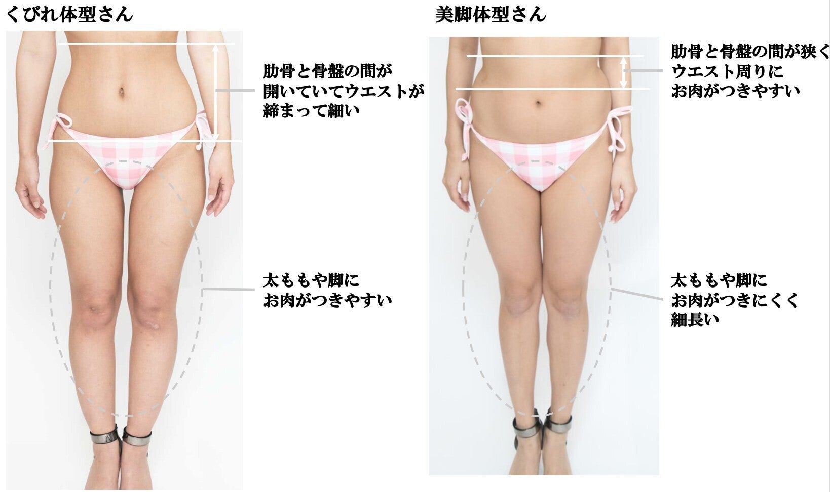 美脚体型さんは、肋骨と骨盤の間が狭くウエスト周りにお肉がつきやすく太ももや脚にお肉がつきにくいパターンの女性です。