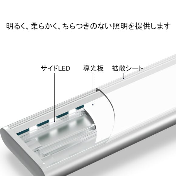 LEDは側面に隠れており、組み込みのライトガイドパネルに垂直に光り、直接に眼との接触を避けます。そして、拡散パネルの特別な層が覆われ、より均一な発光を提供し、目を傷つけることはありません。