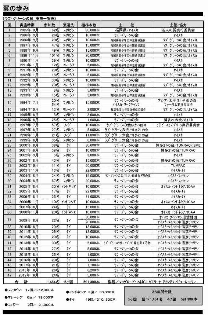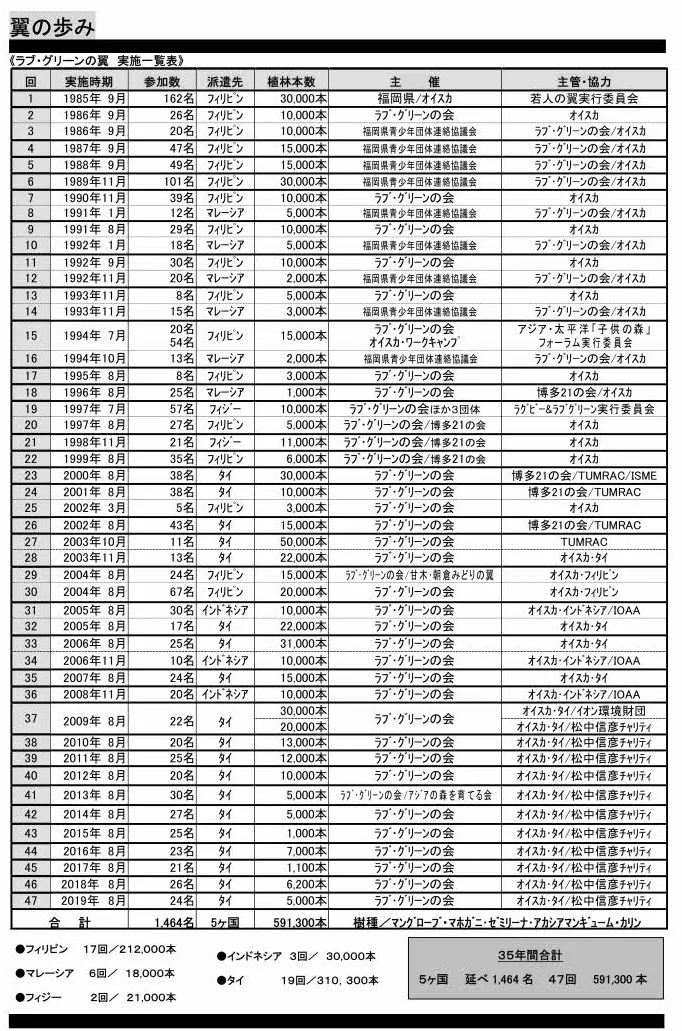 以来、35年間に47回、福岡の人々を中心とした地球緑化推進ボランティアの翼を編成し、アジアの国々の山にマホガニィやアカシアマンギュム、海岸線にはマングローブを植林しています。
