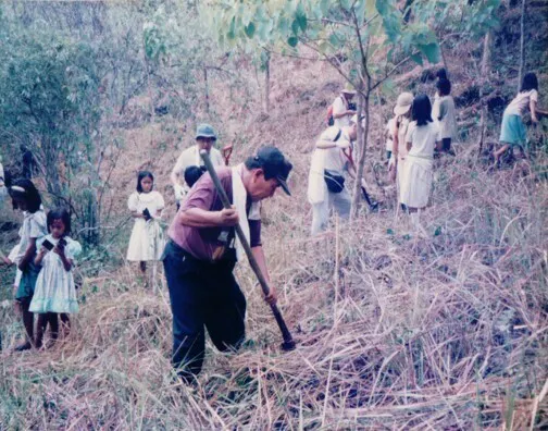 1984年、(公財)オイスカ・ミンダナオ・エコテック農業指導センター所長の故池田廣志さんは、当時、福岡県青年の船に参加した20代の青年たち300人を前に、「フィリピンの山は、はげ山ばかりタイ。」「木がないけん雨が降ると川に土砂が流れ込み農業も出来んし、川が氾濫して海のプランクトンも死んで魚も取れん事なっとるバイ。生態系が壊れとると。」と博多弁で熱く語りました。そのショッキングな言葉と姿が今でも思い出されます。翌年の1985年5月、私は、ミンダナオ島ディポログ市郊外のパマンサランのはげ山に立ち、池田さんの言葉通りの光景を見て、頭をハンマーで殴られるかの衝撃に見舞われました。