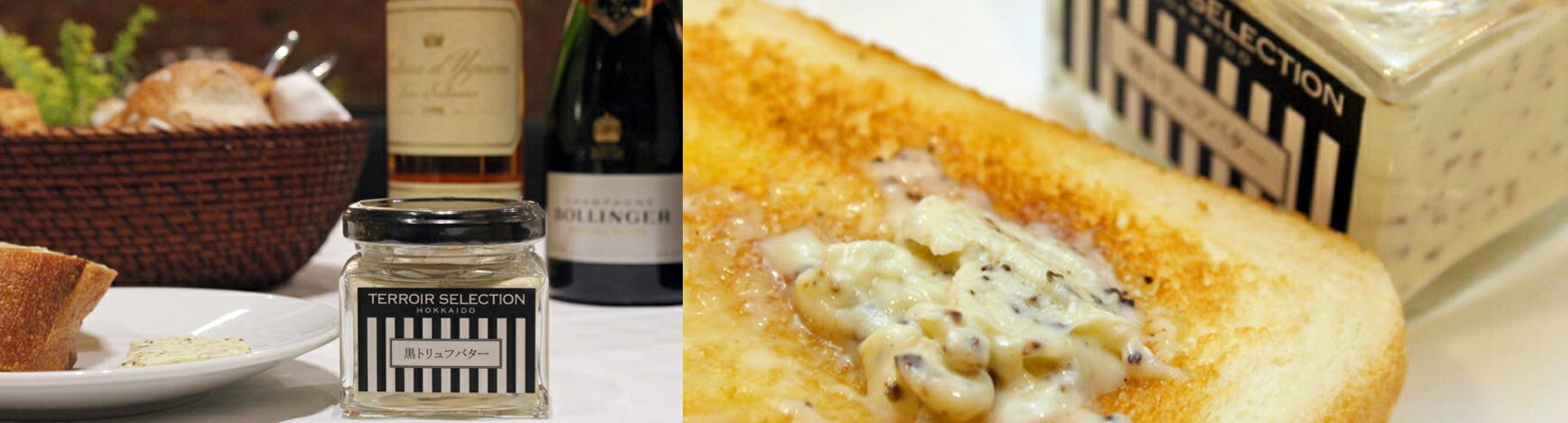 トリュフの贅沢な香りが存分に楽しめるトリュフバターを使用したトースト、クラッカー、ソテーなどをご用意いたします。自然な旨味のみで勝負したバターは素晴らしい芳香を楽しめます。こちらの商品はその場でご購入いただくことも可能です。