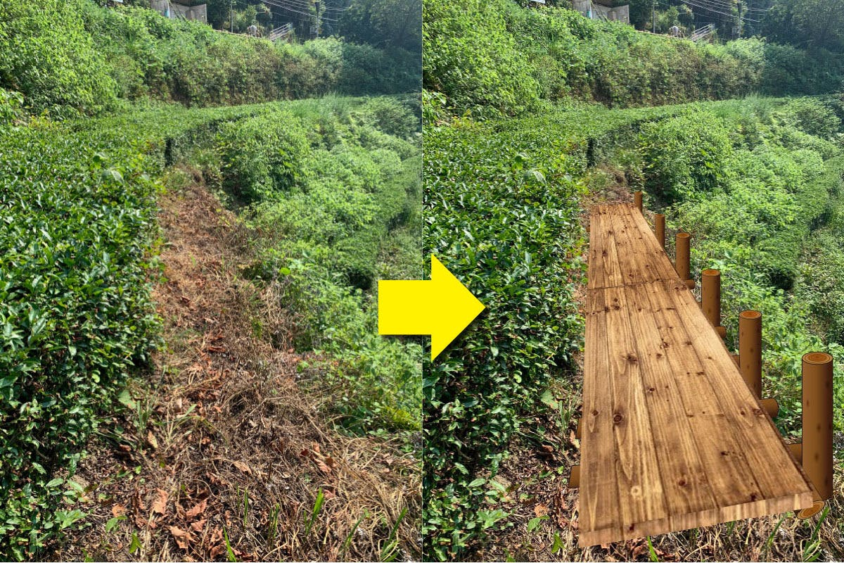 また、土砂崩れの箇所の近くでは土手が徐々に削れてきているところがあり、茶摘みなどの作業中に滑落の危険性が出ています。手摘みで行う茶摘みの摘み手の大半はお年寄りなので、お年寄りでも安心出来る状態で次の茶摘みを迎えたいと思い、土手の歩道整備も盛り込みました。