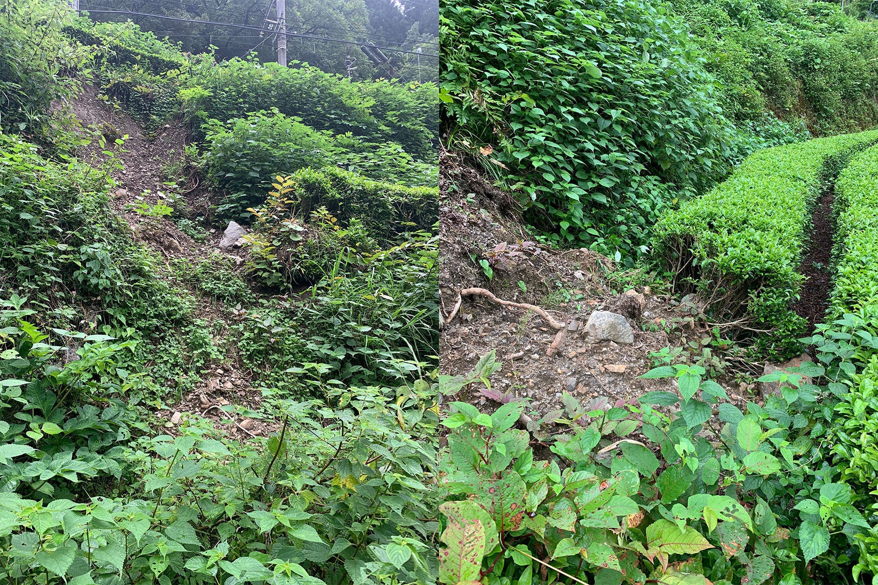 管理させていただいている中井侍駅のすぐ下のお茶畑で2020年7月の大雨により土砂崩れが起ってしまいました。