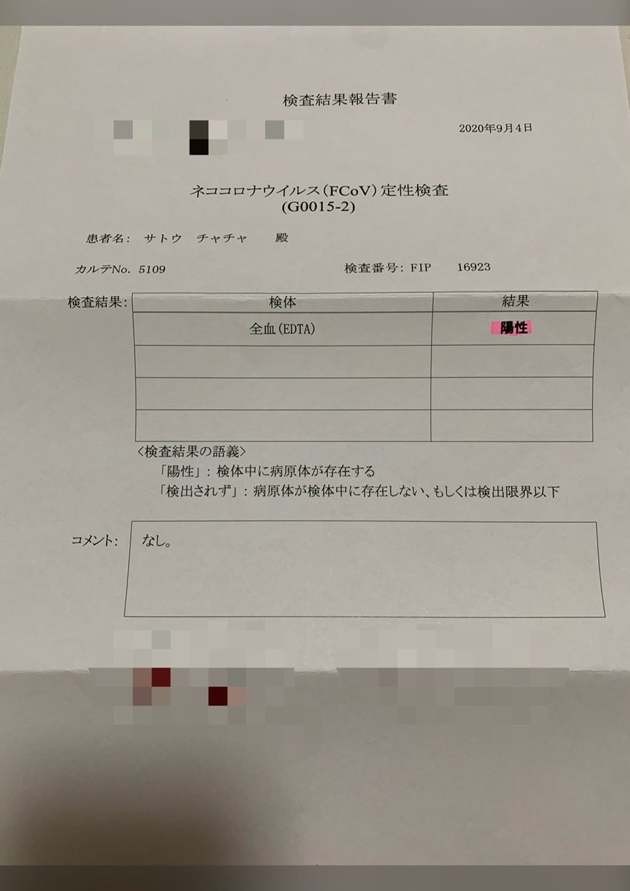 4回ほど通院をし猫風邪、貧血などいろいろ疑いがありましたが検査したところFIP陽性であることが発覚。