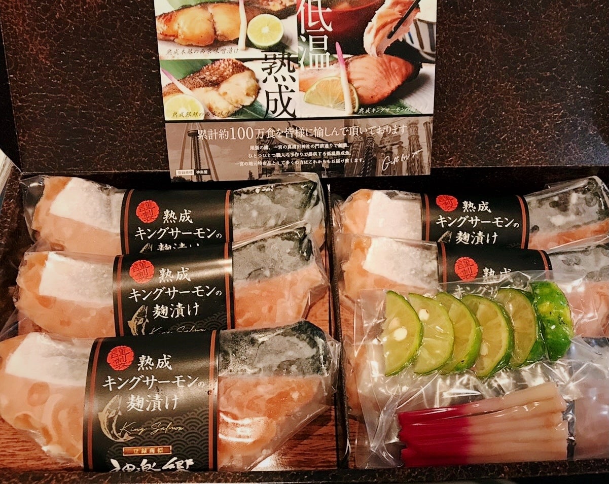 いつもお世話になっております。当店のページへアクセスありがとうございます。当店はふるさと納税に加盟しております。最近はありがたい事に神楽饗の熟成魚を選んでくださる方が多く感じております。画像は当サイトのリターン商品にもなっている【真清田】(熟成キングサーモンの麹漬けセット:すだちと紅白はじかみ入りです。)です。ぜひ、、神楽饗の熟成魚をご賞味ください☆
