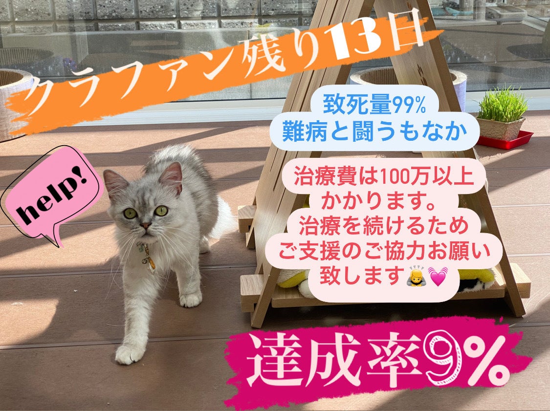 【目標金額変更のご報告】いつも応援して頂きありがとうございます。現在クラウドファンディングではお薬代 約100万+その他治療費 約10万(精密検査など)+クラファン手数料17% 約26万と仮定し目標金額150万と設定していましたが最近ではもなかも体調が安定し投薬前のように頻繁に通院することもなくなりました。また、かかりつけの病院を変えたことで検査代もかなり安く抑えられそうなので目標金額をお薬代+手数料に変更しようと思います。11月12日に最後のお薬を購入予定なので総額を計算し直し改めて目標金額を設定し直します。(※クラファンページでは目標金額の変更は出来ないのでTwitterの表示上のみ変更とさせて頂きます。)その他治療費は加入しているペット保険の補償で70%、最大¥12,000負担していただけるので安く抑えられそうです。目標金額を設定しましたが自分たちで用意できる分はするつもりです。 最近はSNSで同じ病気の猫ちゃんを沢山見ます。 大体の子は症状が重く投薬量が多いため飼い主さんも猫ちゃんも大変な思いをしています。締切が近かったり、困ってる方が沢山います。可能であればその子たち優先でご支援して頂きたいです。 困っている飼い主さんや動物達に温かいご支援が回ることを願っています!