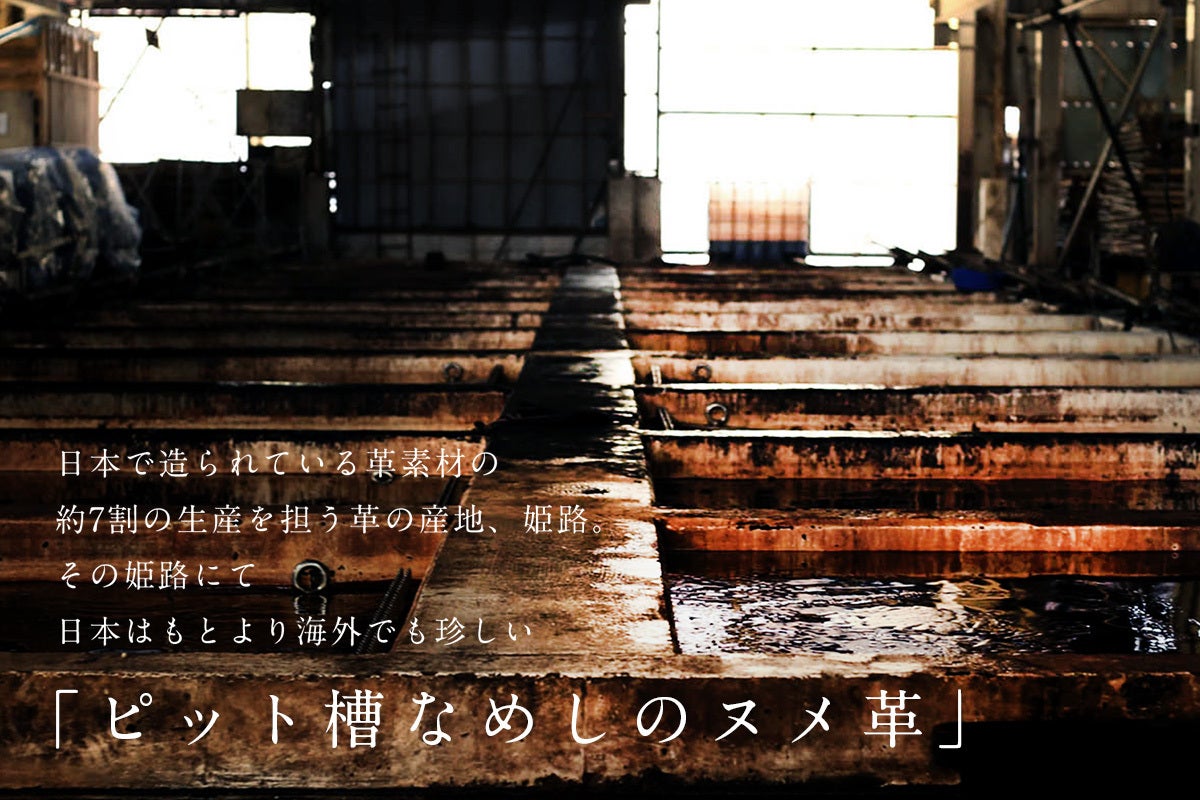 一般的な革と比べて、約30倍の時間をかかるピット槽なめしのヌメ革は、製造過程でほぐされずに繊維が引き締まっているので、コシと強度のある革です。