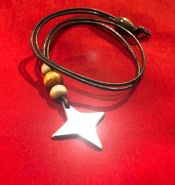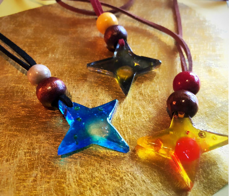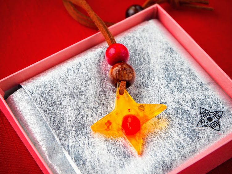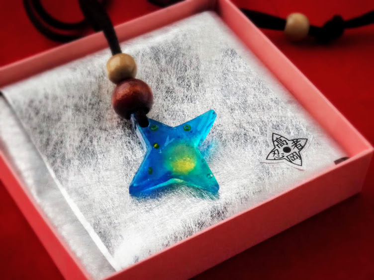 キラキラカラフルな手裏剣型ネックレスです。