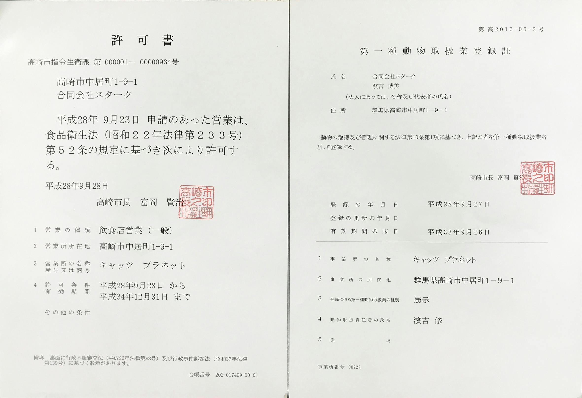 2020/11/25 19:01キャッツプラネットの濱吉です。本日チャレンジ50%達成いたしました事をご報告申し上げます。ご支援いただきました皆様には本当に感謝申し上げます。誠にありがとうございます。さて、ご支援者の皆様やこのクラファンサイトをご覧になり、本当にキャッツプラネットは存在するのか、自治体から許可をもらっているのか疑念を持たれていらっしゃる方からご指摘を頂戴しました。チャレンジまで少しの間ですが、掲載させていただきます。ご不安に思われた皆様にお詫び申し上げます。キャッツプラネットは群馬県高崎市に実在する店舗です。許可証の画像を掲載いたしました。ご確認いただければ幸いです。どうぞよろしくお願いいたします。あと迫る終了まで3日ちょっとです。皆様のご支援ご協力を賜りますよう、よろしくお願い申し上げます。 もっと見る