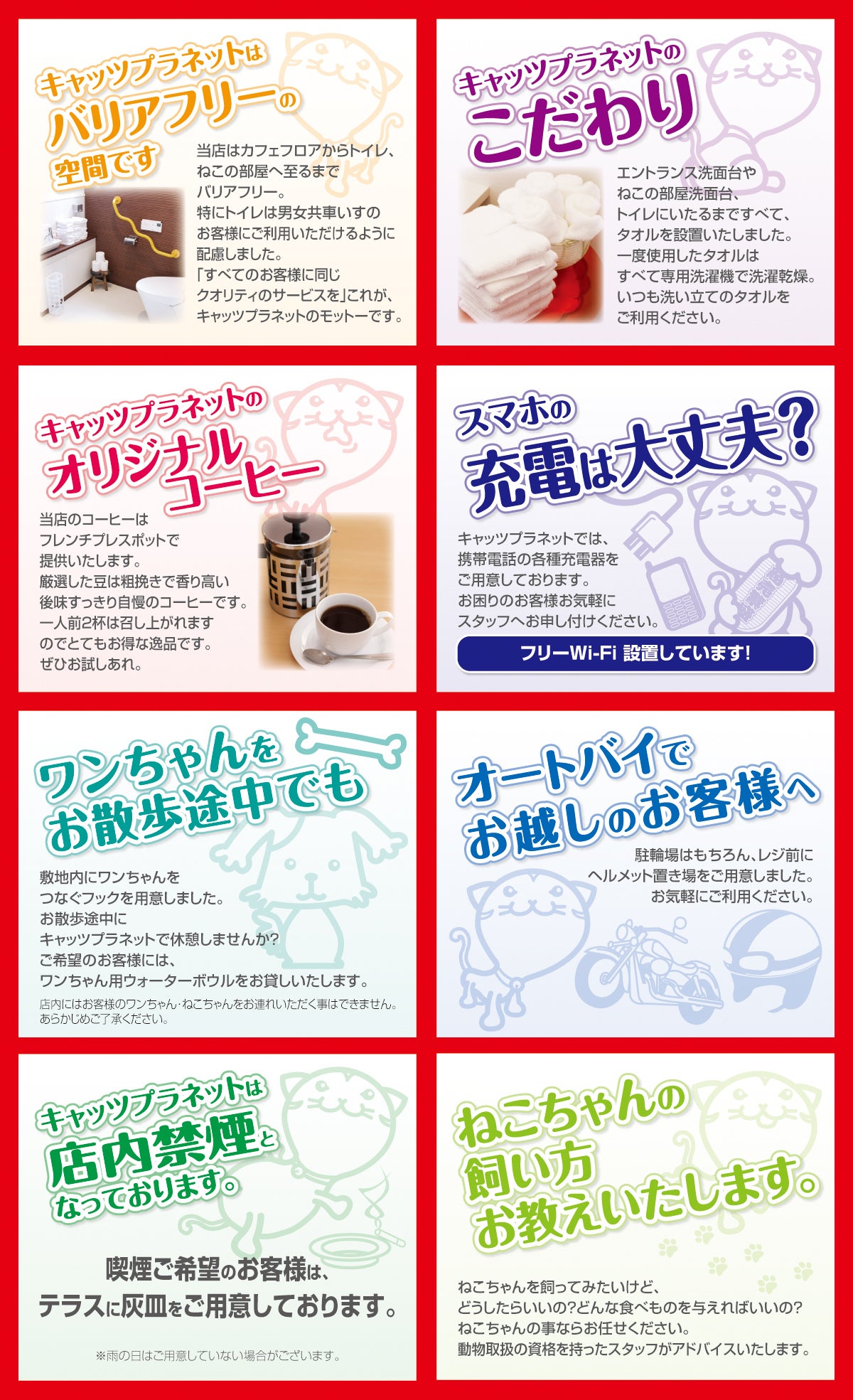キャッツプラネットはカフェフロアとねこの部屋が別々になってますので、カフェだけのご利用でも大歓迎です。バリアフリーの店舗なのでお身体のご不自由なお客様、ご年配のお客様も安心してご利用いただける空間です。カフェフロアでライブやビッフェなどのイベントやスポーツ観戦イベントを開催し地域の皆様に貢献できる店舗として、ねこの部屋と別々の利点を生かし一般カフェとしてもご利用できます。