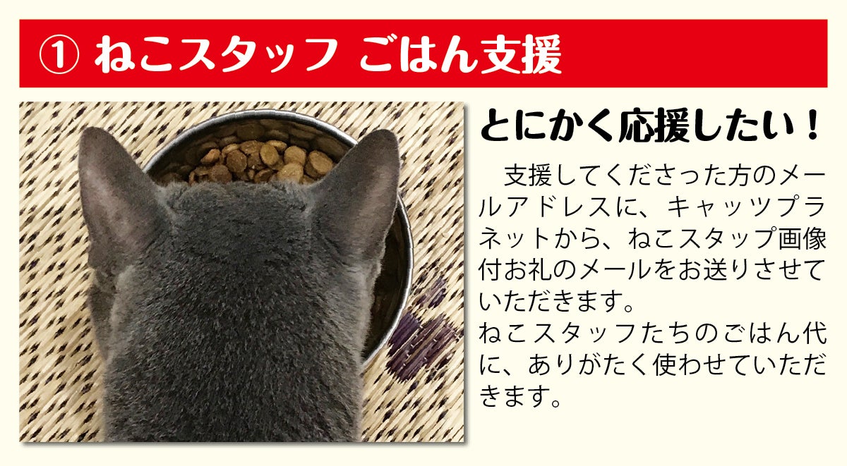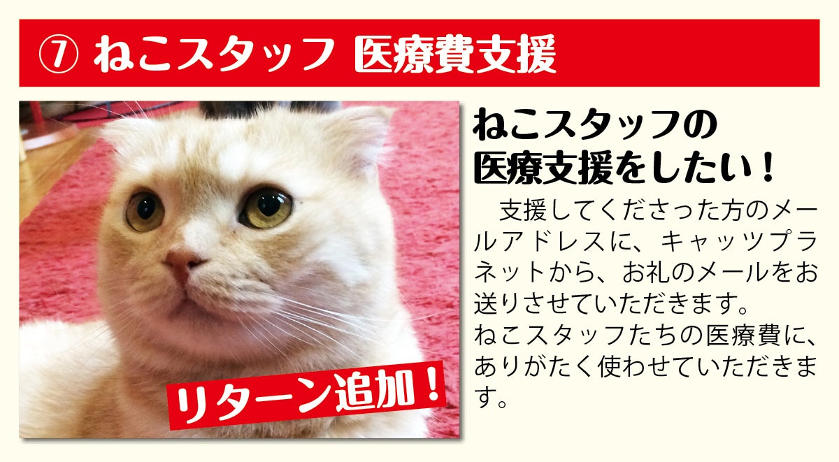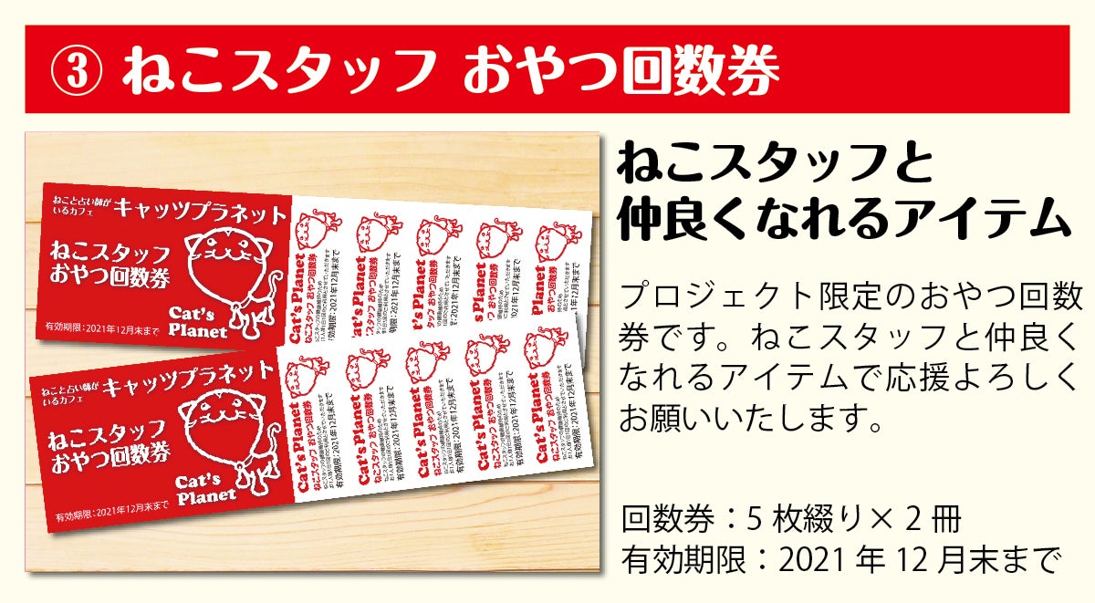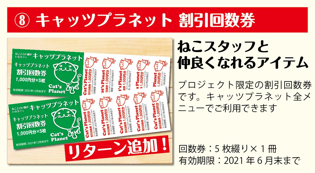 キャッツプラネットでは、新型コロナウイルス感染拡大防止対策として、席数の半減、ねこの部屋の人数制限、営業時間の短縮などを継続しております。そのため店舗で使用できるリターンでは、ご来店いただいた時、お待たせしてしまう事態が大変心苦しいと感じ、お客様にご利用いただける、また全国の皆様に応援していただけるリターンを中心にご用意させていただきました。