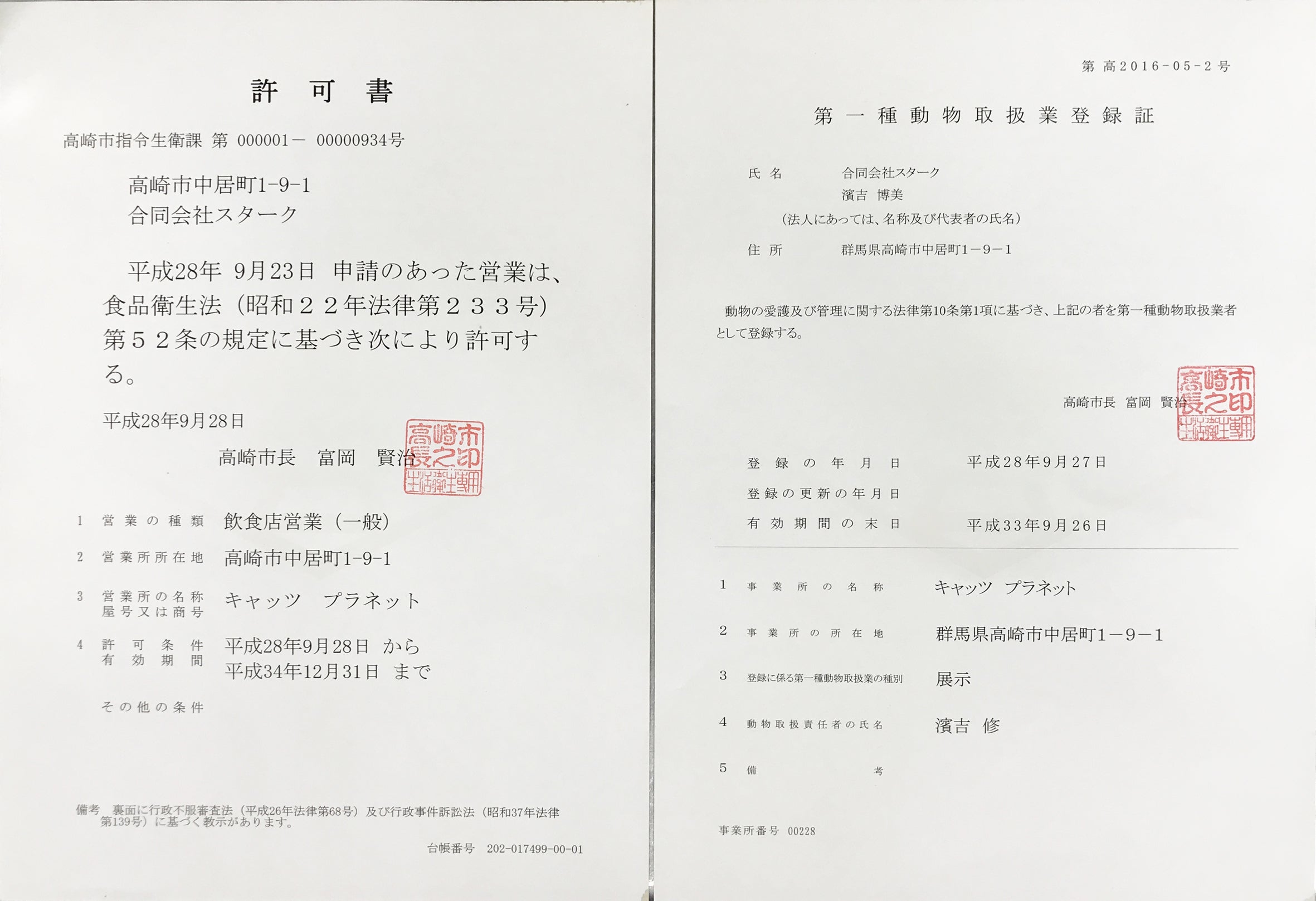 2020/11/25 19:01キャッツプラネットの濱吉です。本日チャレンジ50%達成いたしました事をご報告申し上げます。ご支援いただきました皆様には本当に感謝申し上げます。誠にありがとうございます。さて、ご支援者の皆様やこのクラファンサイトをご覧になり、本当にキャッツプラネットは存在するのか、自治体から許可をもらっているのか疑念を持たれていらっしゃる方からご指摘を頂戴しました。チャレンジまで少しの間ですが、掲載させていただきます。ご不安に思われた皆様にお詫び申し上げます。キャッツプラネットは群馬県高崎市に実在する店舗です。許可証の画像を掲載いたしました。ご確認いただければ幸いです。どうぞよろしくお願いいたします。あと迫る終了まで3日ちょっとです。皆様のご支援ご協力を賜りますよう、よろしくお願い申し上げます。 もっと見る
