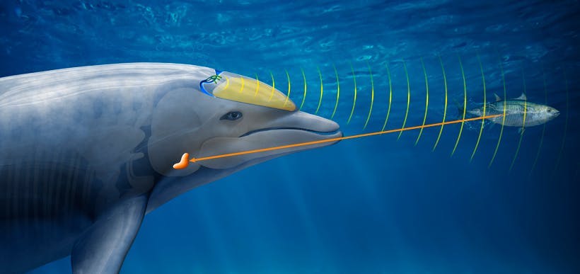 イルカは基本魚やイカなどを食料にし、エコロケーション(ソナーの一種)を駆使して音を出しながら対象が反射した音波をキャッチし、その対象のサイズ、位置、形や、その対象が獲物なのかを特定します。ハンドウイルカのエコロケーションなどは一秒間あたり1000回以上のクリックス音を出します。