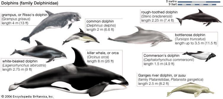 世界で一番大きいイルカはオルカ(シャチ)であり、体長が8m近くに成長します。一番小さいイルカはマウイイルカ(ポポト)であり、体長はわずか1.7mまでにしか成長しません。(画像にはなし)