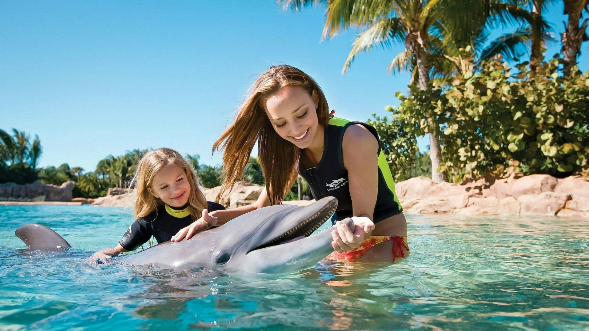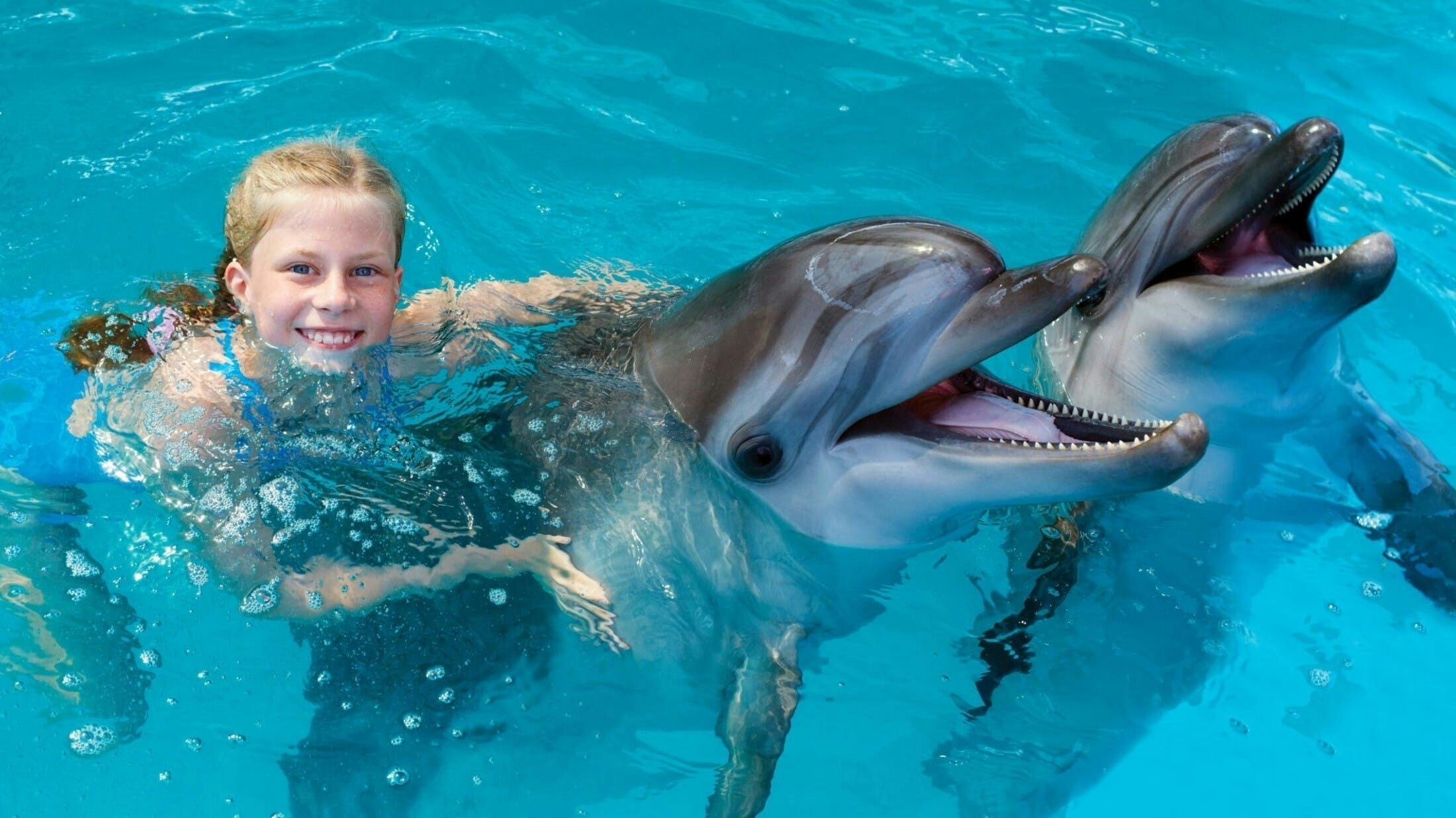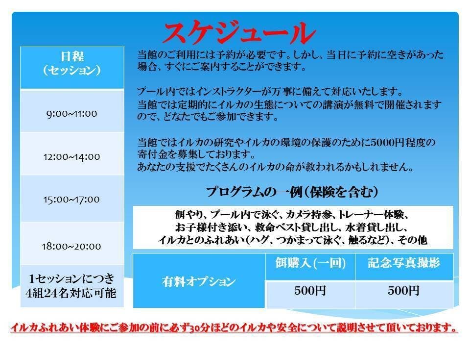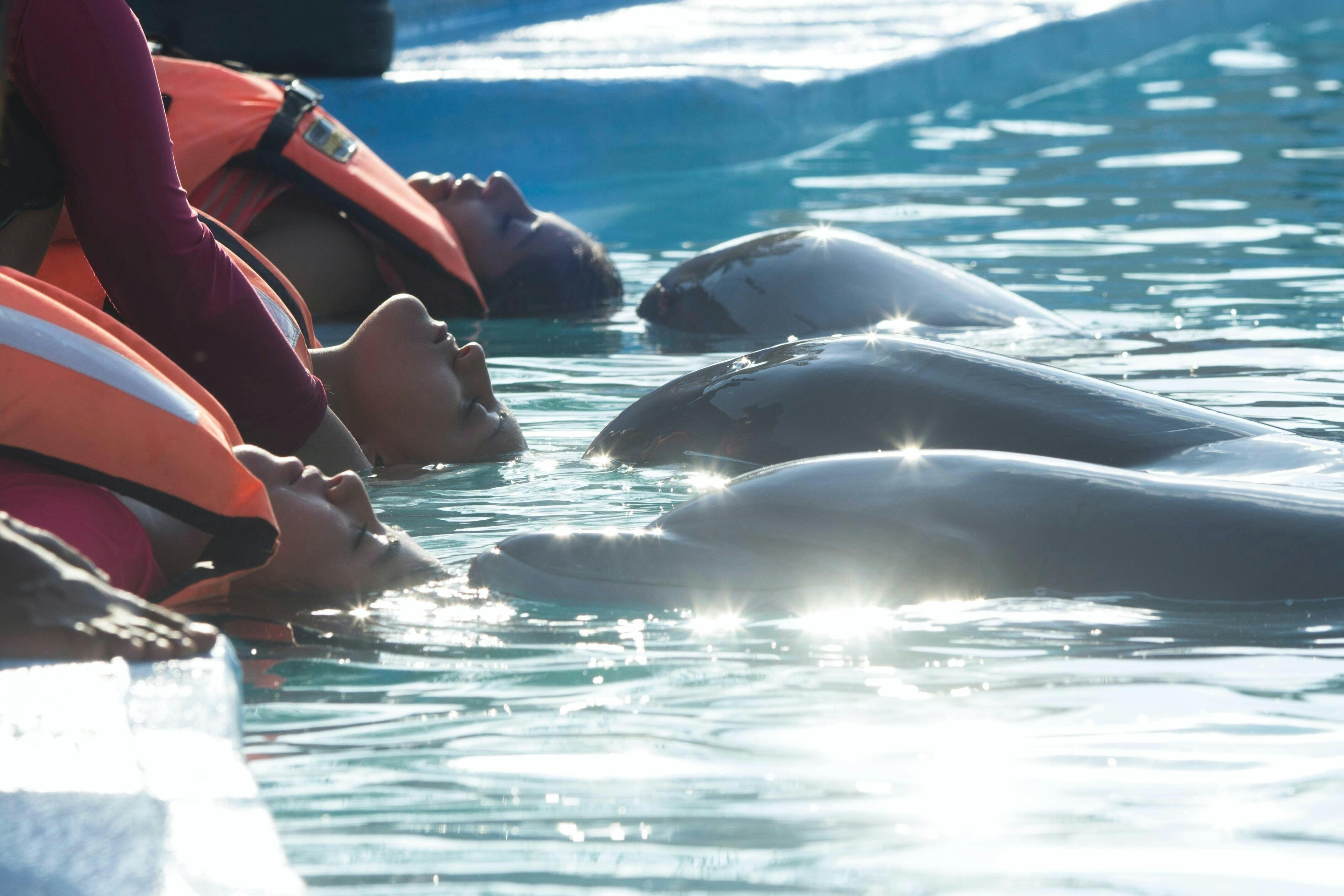 プログラムにご参加の方には、餌をあげたり、イルカにつかまりながら泳いだり、イルカと一緒に写真を撮るなど、様々な貴重な体験をお楽しみいただけます。もしお子様がご一緒の場合スタッフが付き添います。プログラム内容以外に、イルカの生態についての講演会が定期的に無料公開されますので、プログラムにご参加いただいていないご来館者もイルカについての知識を学んでいただけます。