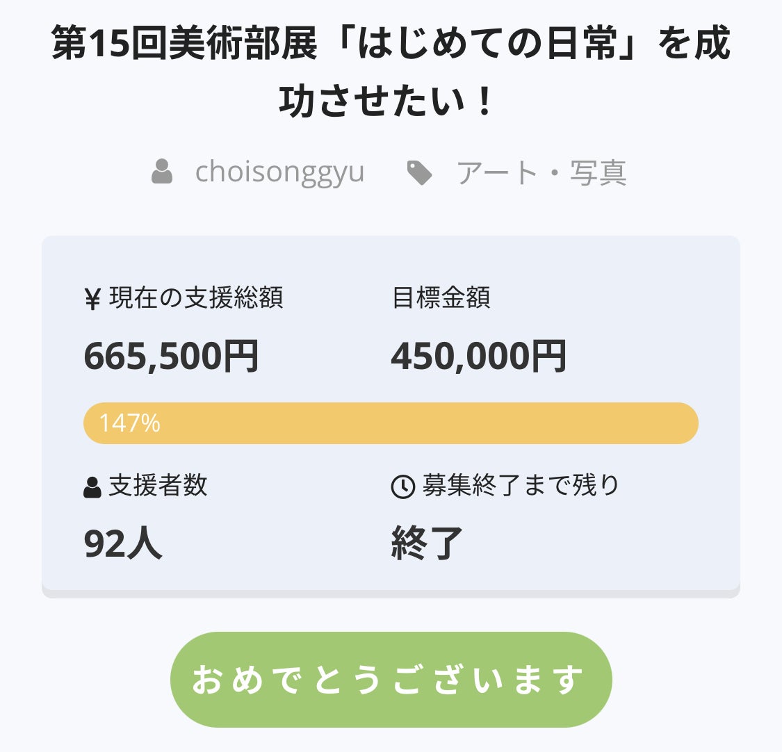このプロジェクトは、2020/10/09に募集を開始し、 92人の支援により 665,500円の資金を集め、 2020/11/30に募集を終了しました