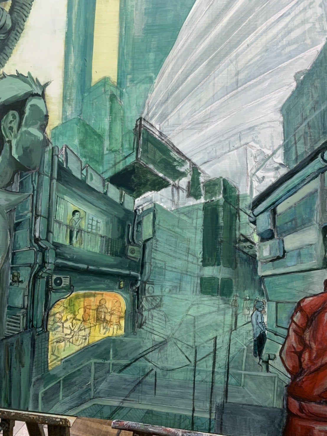私は中央展に向けて平面作品を制作していますが、なかなか構図が定まらず悪戦苦闘しています。やはり、街並みを一から創作するのはなかなか骨が折れます。描いて消しての繰り返しです。楽しい!!
