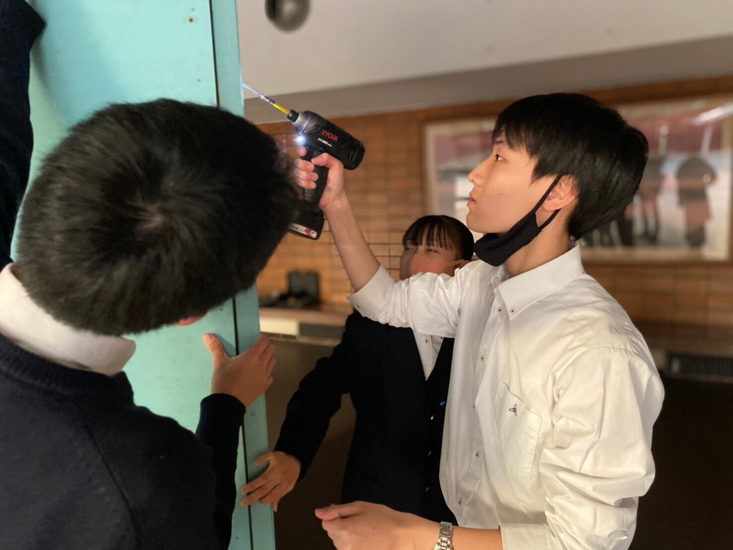 上の写真は3枚のパネルを合わせて、三角柱の形のパネルを作っている風景です。