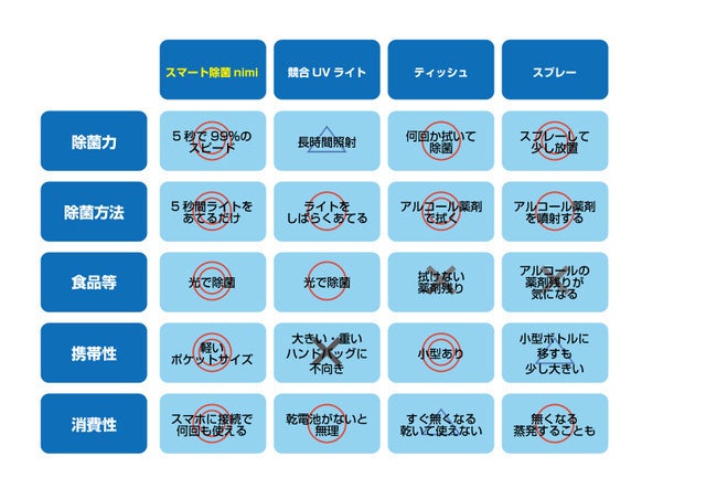 この商品は、スマホ1台あればスマートに瞬間除菌ができます。既存の除菌グッズの携帯するにはかさばる、使おうとしたらなかった、薬剤残りが気になるなどの既存除菌グッズの問題を全て解消しています。軽い、スマホにつけるだけ、ライトなので薬品不使用などです。