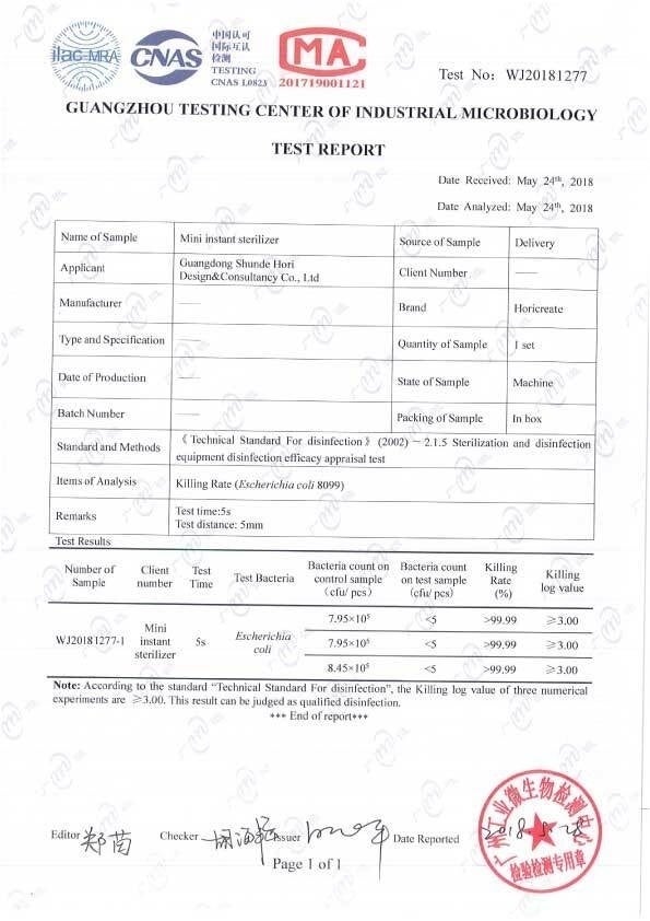 「ピカッシュ」は専門の検査機関「産業微生物学広州試験センター(Guangzhou Testing Center of Industrial Microbiology)」による検査・性能テストをしており、この第3者検査機関で報告書を作成し署名されております。出品する前に2つの検査で報告書を受け取っております。